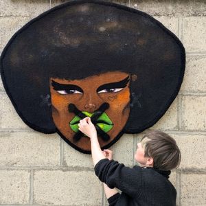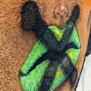 L’œuvre est réalisée en tufting de laine, puis retravaillée à la bombe et à la peinture acrylique.